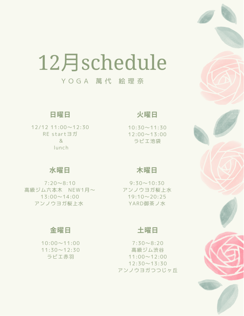 【12月レッスンスケジュール】 lunchの関係で、 時間を10分前倒しに変更しました🙏🏻 . ◉12/12(日)11:10~12:40(1時間30分) 受付11:00~ close13:00 ↓↓↓ ◉12/12(日)11:00~12:30(1時間30分) 受付10:50~ close13:00 【内容】 30miジャーナリ...レッスンスケジュール